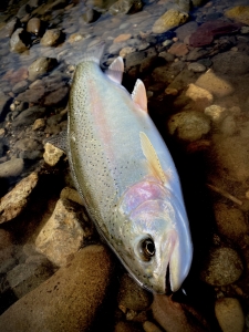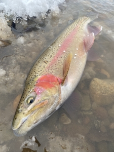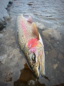 この川で越冬する居着きの個体は錆が入り、痩せていて、ファイトもニジマスの割には、スローで重たい…